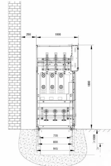 安裝時按環網柜先后順序排列在地基的槽鋼上,將柜體靠緊,并用螺栓固定旋緊,柜面應排列整齊,柜頂與屋頂的距離應大于600mm
