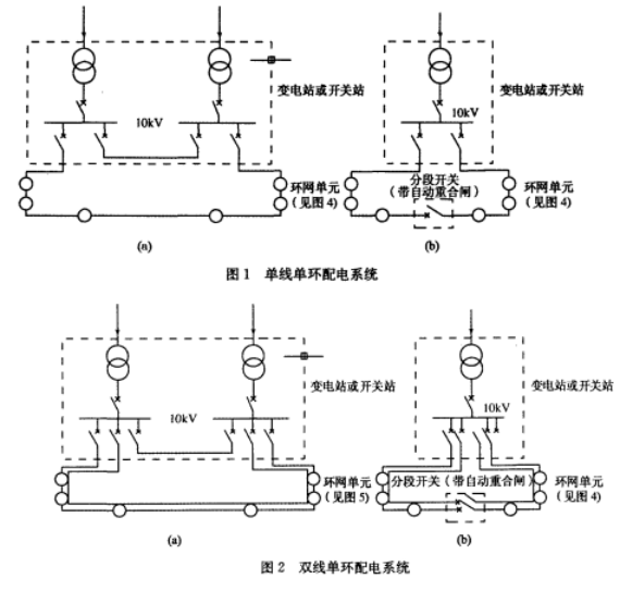 20061月正式實施的江蘇省當地規范《江蘇省工程建造規范》DGJ31/J14-2005中規定,配所--般應優先選用環網單元(環網單元是指環式配電體系中配電所的體系接線)。可見環式配電體系是10kV配電體系的推薦體系和開展方向。