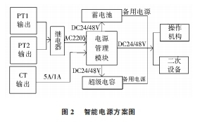 2.6智能電源環(huán)網(wǎng)柜的操作組織、操控器、通訊終端等二次設(shè)備都需求完畢不連續(xù)供電。為了行進(jìn)供電的可靠性,請(qǐng)求在供電電源失電時(shí),二次回路仍然會(huì)有電源,能夠持續(xù)可靠的動(dòng)作,環(huán)網(wǎng)柜中有必要具有備用電源。為了行進(jìn)供電電源的可靠性本電源的規(guī)劃首要選用了如下辦法:(1)環(huán)網(wǎng)柜普通選用雙進(jìn)線(xiàn),兩條進(jìn)線(xiàn)互為備用給電源的充電模塊供電,當(dāng)其中一條進(jìn)線(xiàn)失電時(shí),由繼電器將另一條進(jìn)線(xiàn)的220V電源轉(zhuǎn)給充電模塊,保證整個(gè)柜子的二次回路持續(xù)供電。(2)當(dāng)環(huán)網(wǎng)柜的兩條進(jìn)線(xiàn)都失電的時(shí)分,為了使二次回路持續(xù)帶電,需求由備用電源持續(xù)供電。如今首要的備用電源是不連續(xù)電源(UPS)和蓄電池,還有的選用超級(jí)電容供電。為了行進(jìn)供電的可靠性,本電源方案選用蓄電池與超極電容相分離,兩種電源可互為備用,能夠進(jìn)一步行進(jìn)供電的可靠性。智能電源的方案如圖2所示。