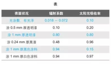 下表給出了金屬外表輻射系數(shù)8與太陽(yáng)光的吸收率示例。