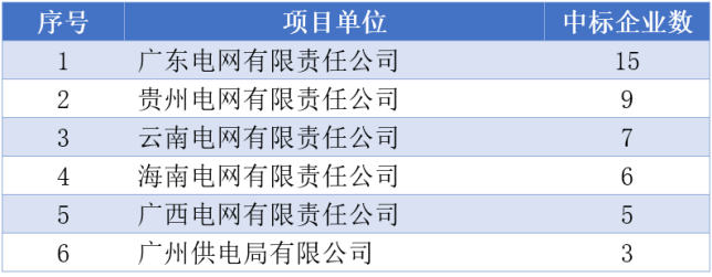 各電力公司中標企業數量方面,在廣東電網公司共有15家企業中標,全部項目單位都有超32家企業中標。